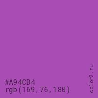Цвет #A94CB4 в цветовой модели RGB обозначается тремя октетами (169, 76, 180) в десятичном формате и #A94CB4 в шестнадцатиричном (hex) формате, которые являются интенсивностью красного 169 (hex A9), интенсивность зелёного 76 (hex 4C) и интенсивность синего 180 (hex B4).