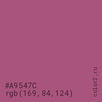 Цвет #A9547C в цветовой модели RGB обозначается тремя октетами (169, 84, 124) в десятичном формате и #A9547C в шестнадцатиричном (hex) формате, которые являются интенсивностью красного 169 (hex A9), интенсивность зелёного 84 (hex 54) и интенсивность синего 124 (hex 7C).
