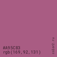 Цвет #A95C83 в цветовой модели RGB обозначается тремя октетами (169, 92, 131) в десятичном формате и #A95C83 в шестнадцатиричном (hex) формате, которые являются интенсивностью красного 169 (hex A9), интенсивность зелёного 92 (hex 5C) и интенсивность синего 131 (hex 83).