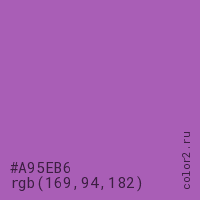 Цвет #A95EB6 в цветовой модели RGB обозначается тремя октетами (169, 94, 182) в десятичном формате и #A95EB6 в шестнадцатиричном (hex) формате, которые являются интенсивностью красного 169 (hex A9), интенсивность зелёного 94 (hex 5E) и интенсивность синего 182 (hex B6).