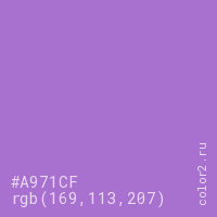 Цвет #A971CF в цветовой модели RGB обозначается тремя октетами (169, 113, 207) в десятичном формате и #A971CF в шестнадцатиричном (hex) формате, которые являются интенсивностью красного 169 (hex A9), интенсивность зелёного 113 (hex 71) и интенсивность синего 207 (hex CF).
