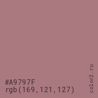 Цвет #A9797F в цветовой модели RGB обозначается тремя октетами (169, 121, 127) в десятичном формате и #A9797F в шестнадцатиричном (hex) формате, которые являются интенсивностью красного 169 (hex A9), интенсивность зелёного 121 (hex 79) и интенсивность синего 127 (hex 7F).