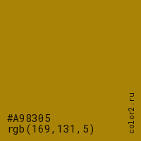 Цвет #A98305 в цветовой модели RGB обозначается тремя октетами (169, 131, 5) в десятичном формате и #A98305 в шестнадцатиричном (hex) формате, которые являются интенсивностью красного 169 (hex A9), интенсивность зелёного 131 (hex 83) и интенсивность синего 5 (hex 05).