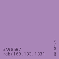 Цвет #A985B7 в цветовой модели RGB обозначается тремя октетами (169, 133, 183) в десятичном формате и #A985B7 в шестнадцатиричном (hex) формате, которые являются интенсивностью красного 169 (hex A9), интенсивность зелёного 133 (hex 85) и интенсивность синего 183 (hex B7).