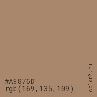 Цвет #A9876D в цветовой модели RGB обозначается тремя октетами (169, 135, 109) в десятичном формате и #A9876D в шестнадцатиричном (hex) формате, которые являются интенсивностью красного 169 (hex A9), интенсивность зелёного 135 (hex 87) и интенсивность синего 109 (hex 6D).
