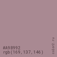 Цвет #A98992 в цветовой модели RGB обозначается тремя октетами (169, 137, 146) в десятичном формате и #A98992 в шестнадцатиричном (hex) формате, которые являются интенсивностью красного 169 (hex A9), интенсивность зелёного 137 (hex 89) и интенсивность синего 146 (hex 92).