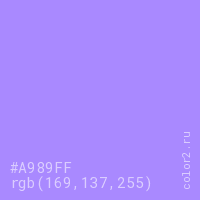 Цвет #A989FF в цветовой модели RGB обозначается тремя октетами (169, 137, 255) в десятичном формате и #A989FF в шестнадцатиричном (hex) формате, которые являются интенсивностью красного 169 (hex A9), интенсивность зелёного 137 (hex 89) и интенсивность синего 255 (hex FF).