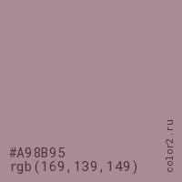 Цвет #A98B95 в цветовой модели RGB обозначается тремя октетами (169, 139, 149) в десятичном формате и #A98B95 в шестнадцатиричном (hex) формате, которые являются интенсивностью красного 169 (hex A9), интенсивность зелёного 139 (hex 8B) и интенсивность синего 149 (hex 95).