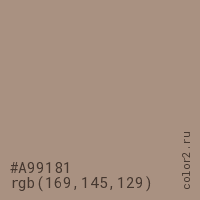 Цвет #A99181 в цветовой модели RGB обозначается тремя октетами (169, 145, 129) в десятичном формате и #A99181 в шестнадцатиричном (hex) формате, которые являются интенсивностью красного 169 (hex A9), интенсивность зелёного 145 (hex 91) и интенсивность синего 129 (hex 81).
