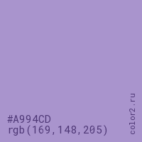 Цвет #A994CD в цветовой модели RGB обозначается тремя октетами (169, 148, 205) в десятичном формате и #A994CD в шестнадцатиричном (hex) формате, которые являются интенсивностью красного 169 (hex A9), интенсивность зелёного 148 (hex 94) и интенсивность синего 205 (hex CD).