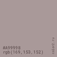 Цвет #A99998 в цветовой модели RGB обозначается тремя октетами (169, 153, 152) в десятичном формате и #A99998 в шестнадцатиричном (hex) формате, которые являются интенсивностью красного 169 (hex A9), интенсивность зелёного 153 (hex 99) и интенсивность синего 152 (hex 98).