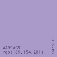 Цвет #A99AC9 в цветовой модели RGB обозначается тремя октетами (169, 154, 201) в десятичном формате и #A99AC9 в шестнадцатиричном (hex) формате, которые являются интенсивностью красного 169 (hex A9), интенсивность зелёного 154 (hex 9A) и интенсивность синего 201 (hex C9).