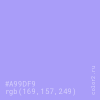 Цвет #A99DF9 в цветовой модели RGB обозначается тремя октетами (169, 157, 249) в десятичном формате и #A99DF9 в шестнадцатиричном (hex) формате, которые являются интенсивностью красного 169 (hex A9), интенсивность зелёного 157 (hex 9D) и интенсивность синего 249 (hex F9).