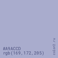 Цвет #A9ACCD в цветовой модели RGB обозначается тремя октетами (169, 172, 205) в десятичном формате и #A9ACCD в шестнадцатиричном (hex) формате, которые являются интенсивностью красного 169 (hex A9), интенсивность зелёного 172 (hex AC) и интенсивность синего 205 (hex CD).