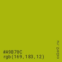 Цвет #A9B70C в цветовой модели RGB обозначается тремя октетами (169, 183, 12) в десятичном формате и #A9B70C в шестнадцатиричном (hex) формате, которые являются интенсивностью красного 169 (hex A9), интенсивность зелёного 183 (hex B7) и интенсивность синего 12 (hex 0C).
