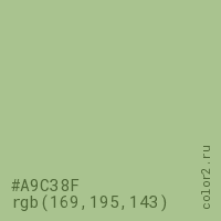 Цвет #A9C38F в цветовой модели RGB обозначается тремя октетами (169, 195, 143) в десятичном формате и #A9C38F в шестнадцатиричном (hex) формате, которые являются интенсивностью красного 169 (hex A9), интенсивность зелёного 195 (hex C3) и интенсивность синего 143 (hex 8F).