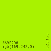 Цвет #A9F200 в цветовой модели RGB обозначается тремя октетами (169, 242, 0) в десятичном формате и #A9F200 в шестнадцатиричном (hex) формате, которые являются интенсивностью красного 169 (hex A9), интенсивность зелёного 242 (hex F2) и интенсивность синего 0 (hex 00).