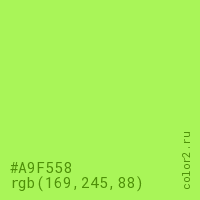 Цвет #A9F558 в цветовой модели RGB обозначается тремя октетами (169, 245, 88) в десятичном формате и #A9F558 в шестнадцатиричном (hex) формате, которые являются интенсивностью красного 169 (hex A9), интенсивность зелёного 245 (hex F5) и интенсивность синего 88 (hex 58).