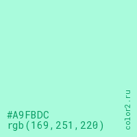 Цвет #A9FBDC в цветовой модели RGB обозначается тремя октетами (169, 251, 220) в десятичном формате и #A9FBDC в шестнадцатиричном (hex) формате, которые являются интенсивностью красного 169 (hex A9), интенсивность зелёного 251 (hex FB) и интенсивность синего 220 (hex DC).