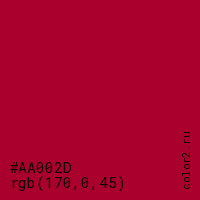 Цвет #AA002D в цветовой модели RGB обозначается тремя октетами (170, 0, 45) в десятичном формате и #AA002D в шестнадцатиричном (hex) формате, которые являются интенсивностью красного 170 (hex AA), интенсивность зелёного 0 (hex 00) и интенсивность синего 45 (hex 2D).