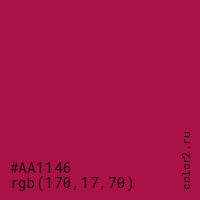 Цвет #AA1146 в цветовой модели RGB обозначается тремя октетами (170, 17, 70) в десятичном формате и #AA1146 в шестнадцатиричном (hex) формате, которые являются интенсивностью красного 170 (hex AA), интенсивность зелёного 17 (hex 11) и интенсивность синего 70 (hex 46).