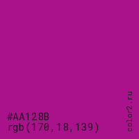 Цвет #AA128B в цветовой модели RGB обозначается тремя октетами (170, 18, 139) в десятичном формате и #AA128B в шестнадцатиричном (hex) формате, которые являются интенсивностью красного 170 (hex AA), интенсивность зелёного 18 (hex 12) и интенсивность синего 139 (hex 8B).