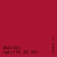 Цвет #AA1432 в цветовой модели RGB обозначается тремя октетами (170, 20, 50) в десятичном формате и #AA1432 в шестнадцатиричном (hex) формате, которые являются интенсивностью красного 170 (hex AA), интенсивность зелёного 20 (hex 14) и интенсивность синего 50 (hex 32).