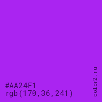 Цвет #AA24F1 в цветовой модели RGB обозначается тремя октетами (170, 36, 241) в десятичном формате и #AA24F1 в шестнадцатиричном (hex) формате, которые являются интенсивностью красного 170 (hex AA), интенсивность зелёного 36 (hex 24) и интенсивность синего 241 (hex F1).