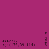 Цвет #AA2772 в цветовой модели RGB обозначается тремя октетами (170, 39, 114) в десятичном формате и #AA2772 в шестнадцатиричном (hex) формате, которые являются интенсивностью красного 170 (hex AA), интенсивность зелёного 39 (hex 27) и интенсивность синего 114 (hex 72).