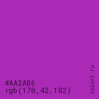 Цвет #AA2AB6 в цветовой модели RGB обозначается тремя октетами (170, 42, 182) в десятичном формате и #AA2AB6 в шестнадцатиричном (hex) формате, которые являются интенсивностью красного 170 (hex AA), интенсивность зелёного 42 (hex 2A) и интенсивность синего 182 (hex B6).