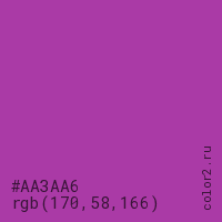 Цвет #AA3AA6 в цветовой модели RGB обозначается тремя октетами (170, 58, 166) в десятичном формате и #AA3AA6 в шестнадцатиричном (hex) формате, которые являются интенсивностью красного 170 (hex AA), интенсивность зелёного 58 (hex 3A) и интенсивность синего 166 (hex A6).