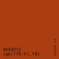 Цвет #AA3D12 в цветовой модели RGB обозначается тремя октетами (170, 61, 18) в десятичном формате и #AA3D12 в шестнадцатиричном (hex) формате, которые являются интенсивностью красного 170 (hex AA), интенсивность зелёного 61 (hex 3D) и интенсивность синего 18 (hex 12).