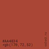 Цвет #AA4834 в цветовой модели RGB обозначается тремя октетами (170, 72, 52) в десятичном формате и #AA4834 в шестнадцатиричном (hex) формате, которые являются интенсивностью красного 170 (hex AA), интенсивность зелёного 72 (hex 48) и интенсивность синего 52 (hex 34).