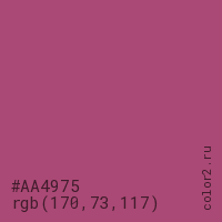 Цвет #AA4975 в цветовой модели RGB обозначается тремя октетами (170, 73, 117) в десятичном формате и #AA4975 в шестнадцатиричном (hex) формате, которые являются интенсивностью красного 170 (hex AA), интенсивность зелёного 73 (hex 49) и интенсивность синего 117 (hex 75).