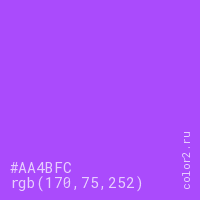 Цвет RGB(170, 75, 252) в процентом отношении количества цвета состоит из 66.7% красного (red), 29.4% зелёного (green) и 98.8% синего (blue).