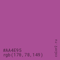 Цвет #AA4E95 в цветовой модели RGB обозначается тремя октетами (170, 78, 149) в десятичном формате и #AA4E95 в шестнадцатиричном (hex) формате, которые являются интенсивностью красного 170 (hex AA), интенсивность зелёного 78 (hex 4E) и интенсивность синего 149 (hex 95).