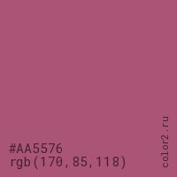 Цвет #AA5576 в цветовой модели RGB обозначается тремя октетами (170, 85, 118) в десятичном формате и #AA5576 в шестнадцатиричном (hex) формате, которые являются интенсивностью красного 170 (hex AA), интенсивность зелёного 85 (hex 55) и интенсивность синего 118 (hex 76).