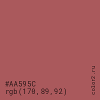 Цвет #AA595C в цветовой модели RGB обозначается тремя октетами (170, 89, 92) в десятичном формате и #AA595C в шестнадцатиричном (hex) формате, которые являются интенсивностью красного 170 (hex AA), интенсивность зелёного 89 (hex 59) и интенсивность синего 92 (hex 5C).