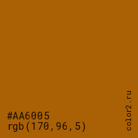 Цвет #AA6005 в цветовой модели RGB обозначается тремя октетами (170, 96, 5) в десятичном формате и #AA6005 в шестнадцатиричном (hex) формате, которые являются интенсивностью красного 170 (hex AA), интенсивность зелёного 96 (hex 60) и интенсивность синего 5 (hex 05).