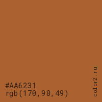 Цвет #AA6231 в цветовой модели RGB обозначается тремя октетами (170, 98, 49) в десятичном формате и #AA6231 в шестнадцатиричном (hex) формате, которые являются интенсивностью красного 170 (hex AA), интенсивность зелёного 98 (hex 62) и интенсивность синего 49 (hex 31).