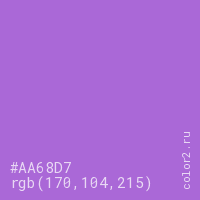 Цвет #AA68D7 в цветовой модели RGB обозначается тремя октетами (170, 104, 215) в десятичном формате и #AA68D7 в шестнадцатиричном (hex) формате, которые являются интенсивностью красного 170 (hex AA), интенсивность зелёного 104 (hex 68) и интенсивность синего 215 (hex D7).