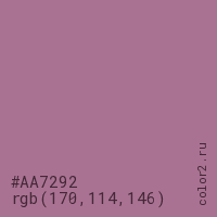Цвет #AA7292 в цветовой модели RGB обозначается тремя октетами (170, 114, 146) в десятичном формате и #AA7292 в шестнадцатиричном (hex) формате, которые являются интенсивностью красного 170 (hex AA), интенсивность зелёного 114 (hex 72) и интенсивность синего 146 (hex 92).