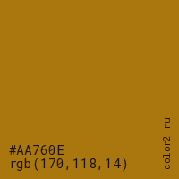 Цвет #AA760E в цветовой модели RGB обозначается тремя октетами (170, 118, 14) в десятичном формате и #AA760E в шестнадцатиричном (hex) формате, которые являются интенсивностью красного 170 (hex AA), интенсивность зелёного 118 (hex 76) и интенсивность синего 14 (hex 0E).