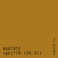 Цвет #AA781F в цветовой модели RGB обозначается тремя октетами (170, 120, 31) в десятичном формате и #AA781F в шестнадцатиричном (hex) формате, которые являются интенсивностью красного 170 (hex AA), интенсивность зелёного 120 (hex 78) и интенсивность синего 31 (hex 1F).