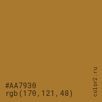Цвет #AA7930 в цветовой модели RGB обозначается тремя октетами (170, 121, 48) в десятичном формате и #AA7930 в шестнадцатиричном (hex) формате, которые являются интенсивностью красного 170 (hex AA), интенсивность зелёного 121 (hex 79) и интенсивность синего 48 (hex 30).