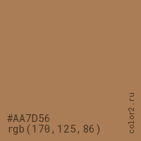 Цвет #AA7D56 в цветовой модели RGB обозначается тремя октетами (170, 125, 86) в десятичном формате и #AA7D56 в шестнадцатиричном (hex) формате, которые являются интенсивностью красного 170 (hex AA), интенсивность зелёного 125 (hex 7D) и интенсивность синего 86 (hex 56).