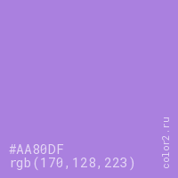 Цвет #AA80DF в цветовой модели RGB обозначается тремя октетами (170, 128, 223) в десятичном формате и #AA80DF в шестнадцатиричном (hex) формате, которые являются интенсивностью красного 170 (hex AA), интенсивность зелёного 128 (hex 80) и интенсивность синего 223 (hex DF).
