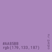 Цвет #AA85BB в цветовой модели RGB обозначается тремя октетами (170, 133, 187) в десятичном формате и #AA85BB в шестнадцатиричном (hex) формате, которые являются интенсивностью красного 170 (hex AA), интенсивность зелёного 133 (hex 85) и интенсивность синего 187 (hex BB).