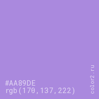 Цвет #AA89DE в цветовой модели RGB обозначается тремя октетами (170, 137, 222) в десятичном формате и #AA89DE в шестнадцатиричном (hex) формате, которые являются интенсивностью красного 170 (hex AA), интенсивность зелёного 137 (hex 89) и интенсивность синего 222 (hex DE).