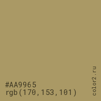 Цвет #AA9965 в цветовой модели RGB обозначается тремя октетами (170, 153, 101) в десятичном формате и #AA9965 в шестнадцатиричном (hex) формате, которые являются интенсивностью красного 170 (hex AA), интенсивность зелёного 153 (hex 99) и интенсивность синего 101 (hex 65).